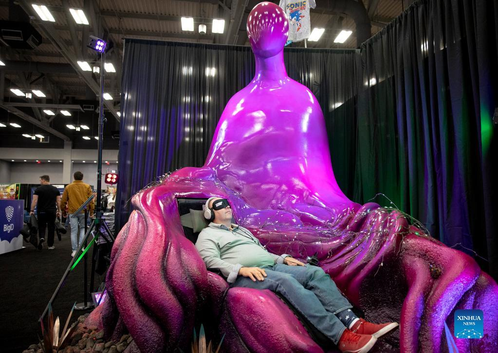 A man experiences an installation titled "The Hum," a fully immersive sound exhibit during the Creative Industries Expo at South by Southwest (SXSW) Conference and Festivals in Austin, Texas, the United States on March 13, 2022. The Creative Industries Expo at SXSW Conference and Festivals opened on March 13, featuring content aimed to promote discovery, education and inspiration. (Photo by Nick Wagner/Xinhua)