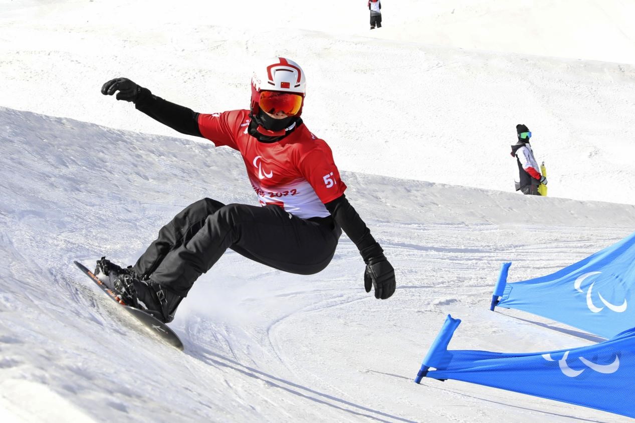 Athletes take part in official training in snowboard banked slalom at Genting Snow Park in Zhangjiakou competition zone of Beijing 2022 Paralympic Winter Games, March 9, 2022. (People’s Daily Online/Weng Qiyu)