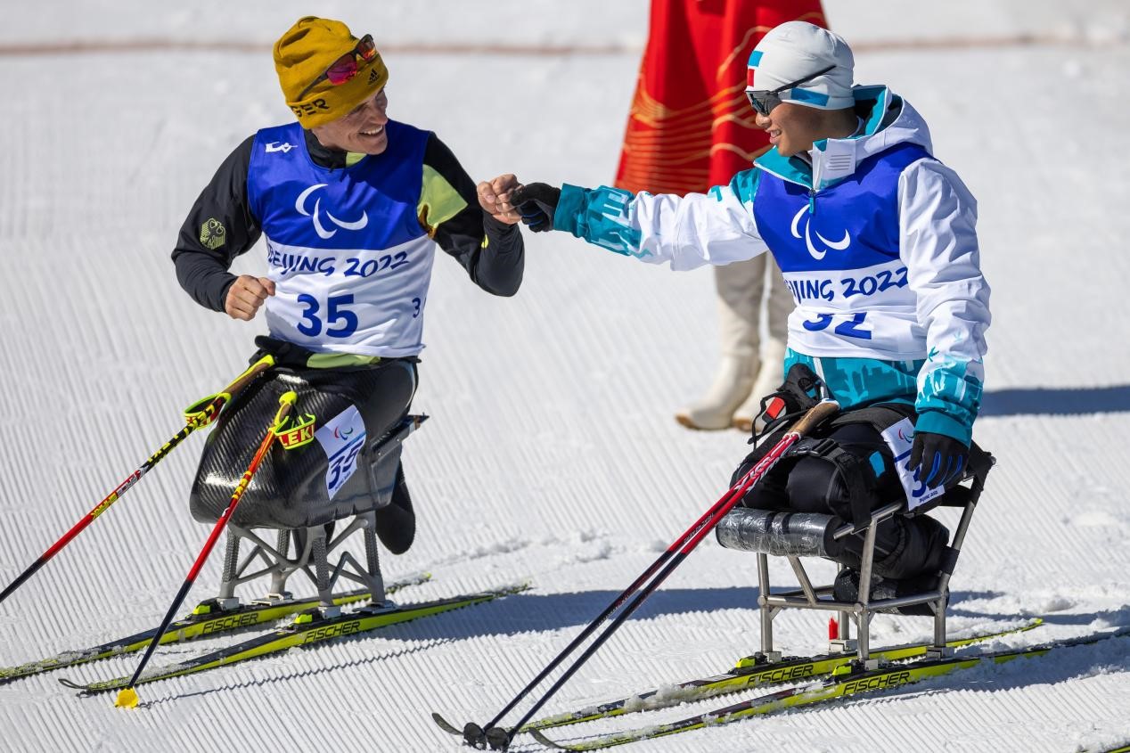 Chinese athlete Liu Mengtao (right) and German athlete Martin Fleig greet each other with a fist bump after the Para biathlon men’s middle distance sitting competition at the Beijing 2022 Paralympic Winter Games, March 8, 2022. (People’s Daily Online/Weng Qiyu)