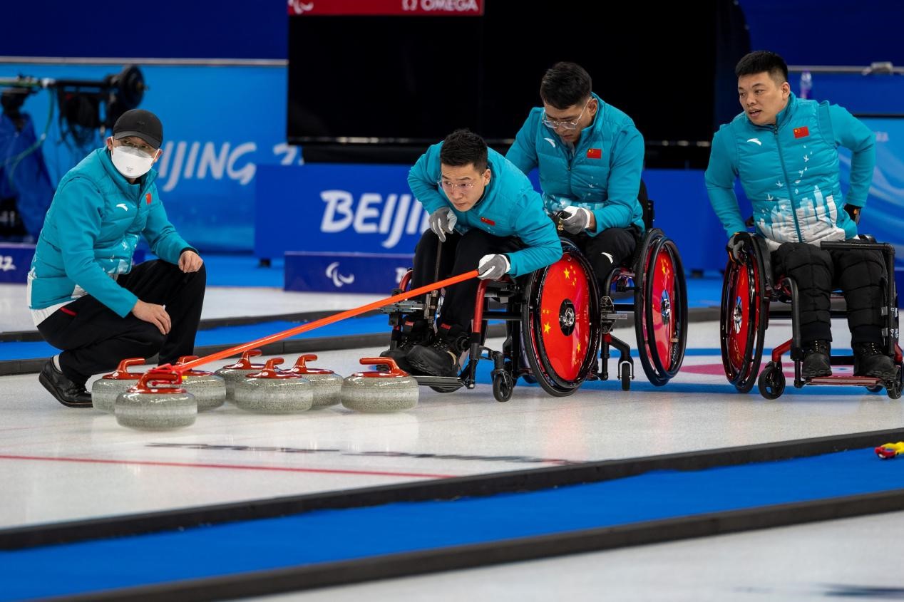 Members of China’s wheelchair curling team are in training for the Beijing 2022 Paralympic Winter Games at the “Ice Cube”, a venue converted from the National Aquatics Center, also known as the “Water Cube”, March 3, 2022. (People’s Daily Online/Weng Qiyu)
