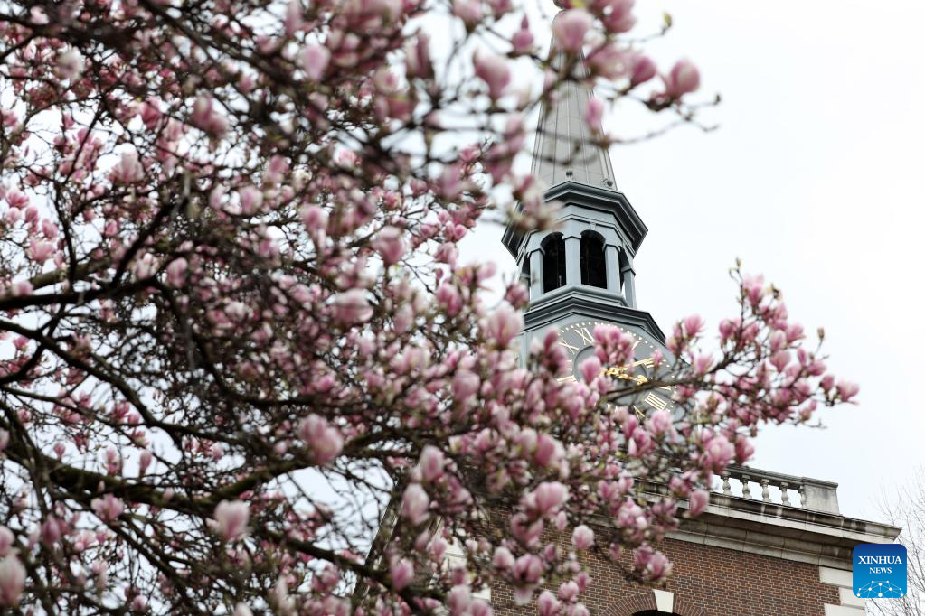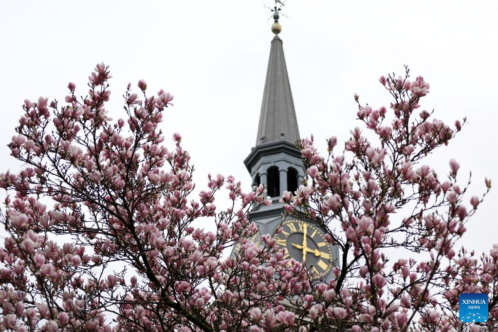 Flowers are seen in front of St James's Church in London, Britain, March 14, 2022. (Xinhua/Li Ying)