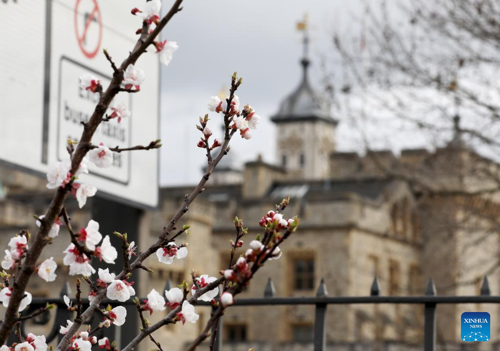 Flowers are seen near the Tower of London in London, Britain, March 14, 2022. (Xinhua/Li Ying)