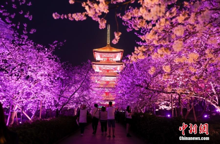 Night view of blooming cherry blossoms at the East Lake Park in Wuhan, central China's Hubei Province, March 14, 2022. The blossoms are beautifully decorated by colorful lights for the night time, giving the park a charming and dream-like atmosphere and attracting lots of visitors. (Photo: China News Service/Zou Hao)