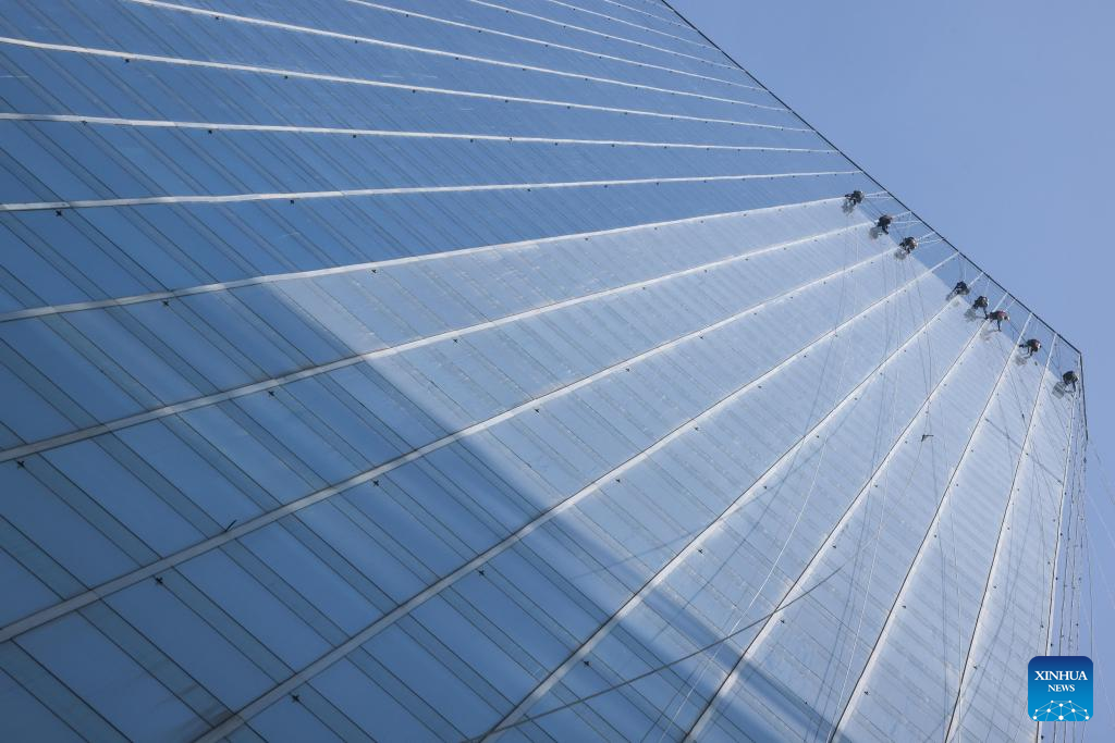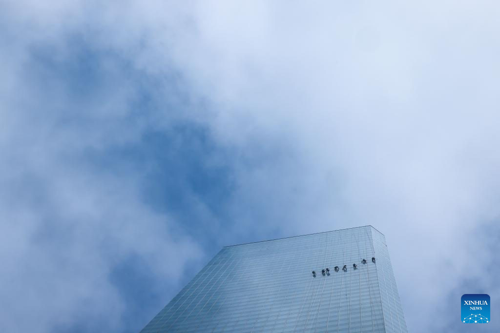 A skyscraper window cleaner fastens his safety harness before cleaning the exterior of Guiyang International Trade Center in Guiyang, southwest China's Guizhou Province, March 15, 2022. The 335-meter-high twin skyscrapers of Guiyang International Trade Center recently saw their first exterior wall cleaning this year. The cleaning, carried out by eight workers, is expected to take about 20 days. (Xinhua/Ou Dongqu)