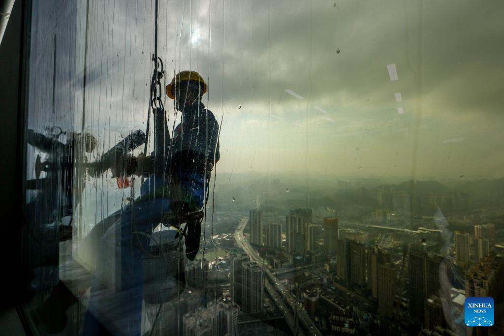 A skyscraper window cleaner cleans the exterior of Guiyang International Trade Center in Guiyang, southwest China's Guizhou Province, March 15, 2022. The 335-meter-high twin skyscrapers of Guiyang International Trade Center recently saw their first exterior wall cleaning this year. The cleaning, carried out by eight workers, is expected to take about 20 days. (Xinhua/Ou Dongqu)