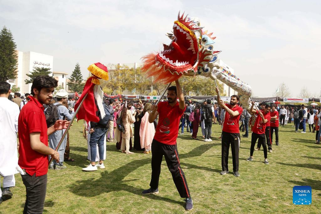 Pakistani students perform dragon dance during an international cultural festival at the National University of Modern Languages (NUML) in Islamabad, capital of Pakistan on March 14, 2022. (Xinhua/Ahmad Kamal)