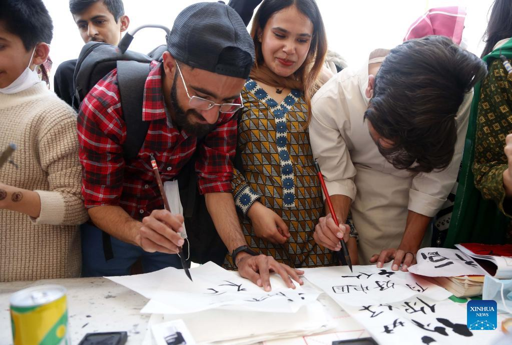 Students learn to write Chinese calligraphy during an international cultural festival at the National University of Modern Languages (NUML) in Islamabad, capital of Pakistan on March 14, 2022. (Xinhua/Ahmad Kamal)