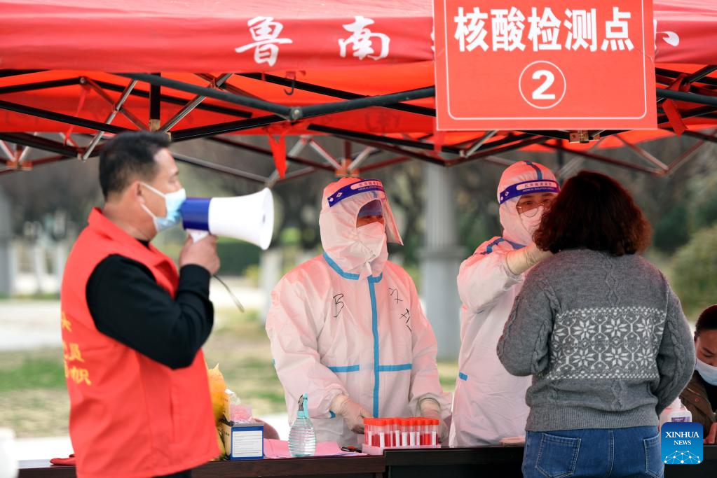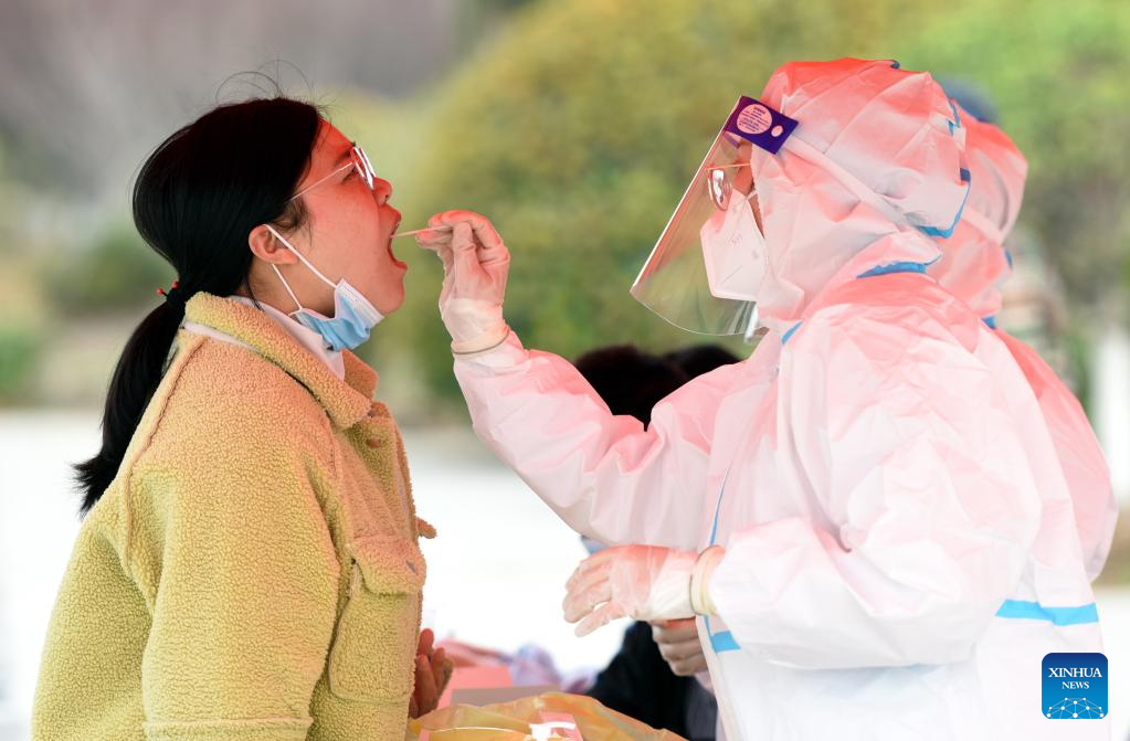 A medical worker takes a swab sample from a resident for nucleic acid testing in Shuiquan Township of Zaozhuang City, east China's Shandong Province, March 15, 2022. (Photo by Liu Mingxiang/Xinhua)