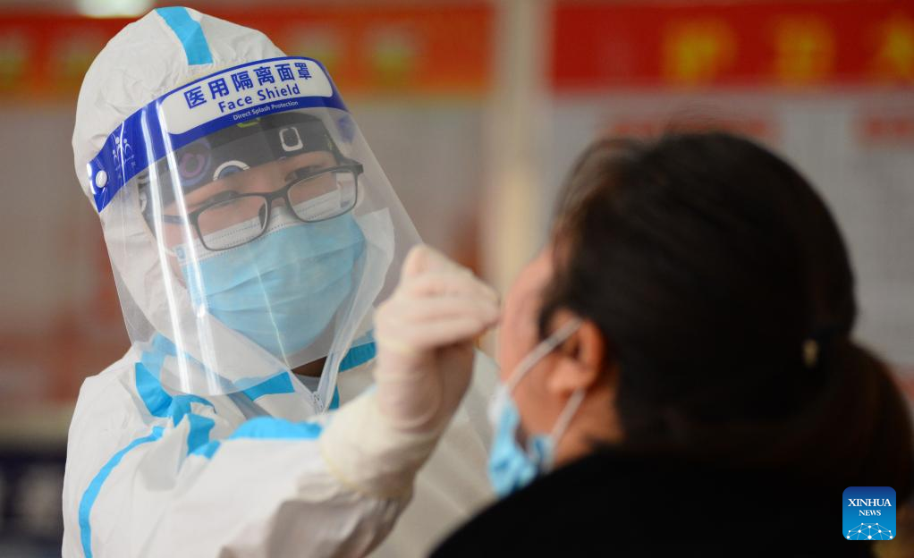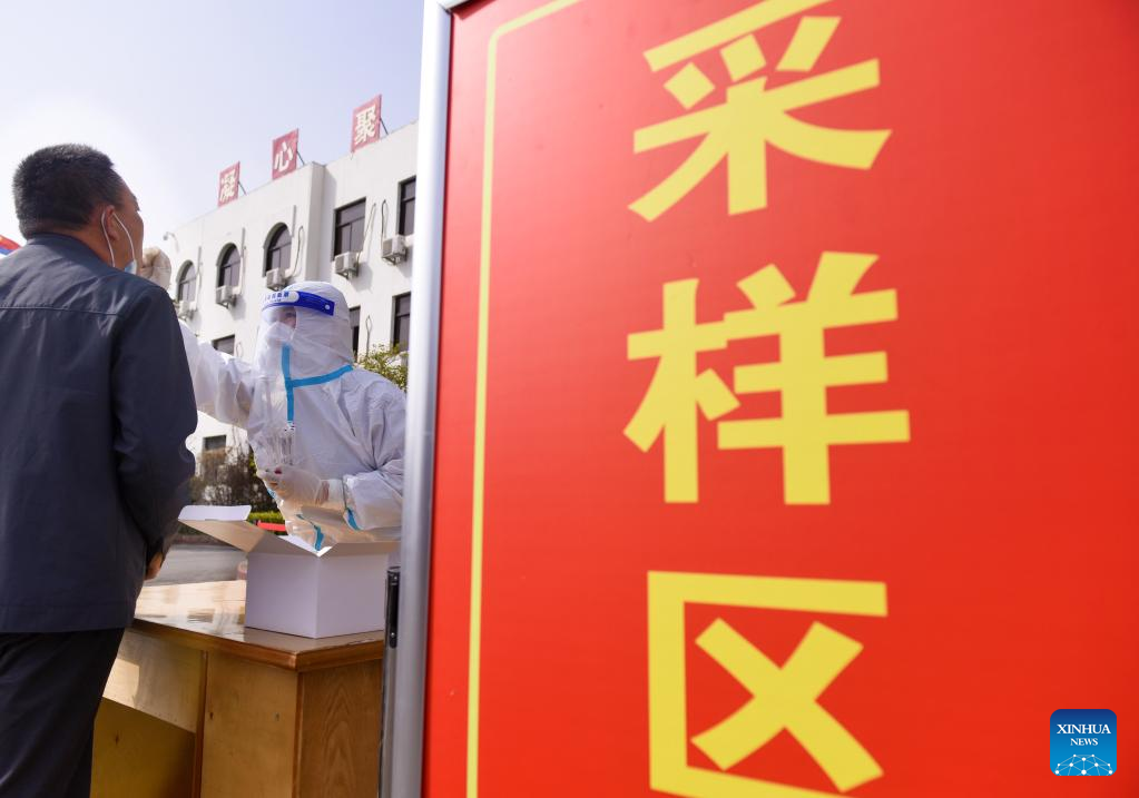 A medical worker takes a swab sample from a resident for nucleic acid testing in Xigang Township of Tengzhou City, east China's Shandong Province, March 15, 2022. (Photo by Li Zhijun/Xinhua)