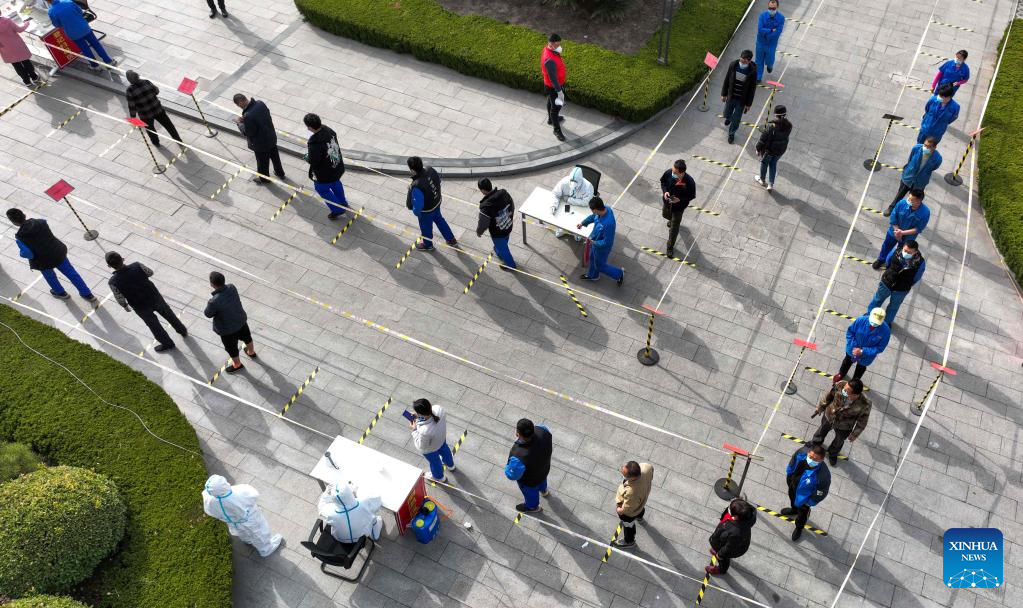 Aerial photo shows employees lining up for nucleic acid testing at a company in Qingzhou City, east China's Shandong Province, March 15, 2022. (Photo by Wang Jilin/Xinhua)