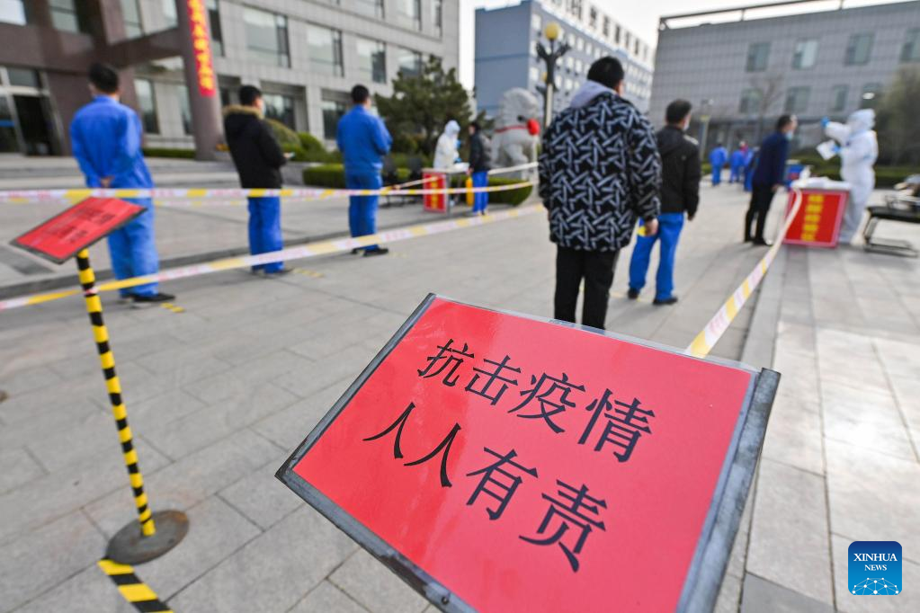 Employees queue up for nucleic acid testing at a company in Qingzhou City, east China's Shandong Province, March 15, 2022. (Photo by Wang Jilin/Xinhua)