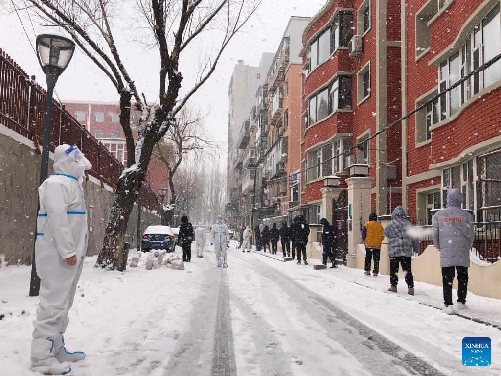 Cellphone photo taken on March 15, 2022 shows residents lining up for nucleic acid test in Changchun, northeast China's Jilin Province, March 15, 2022. Jilin Province reported 3,076 new locally transmitted COVID-19 cases on Monday. (Xinhua/Chu Xiaoliang)