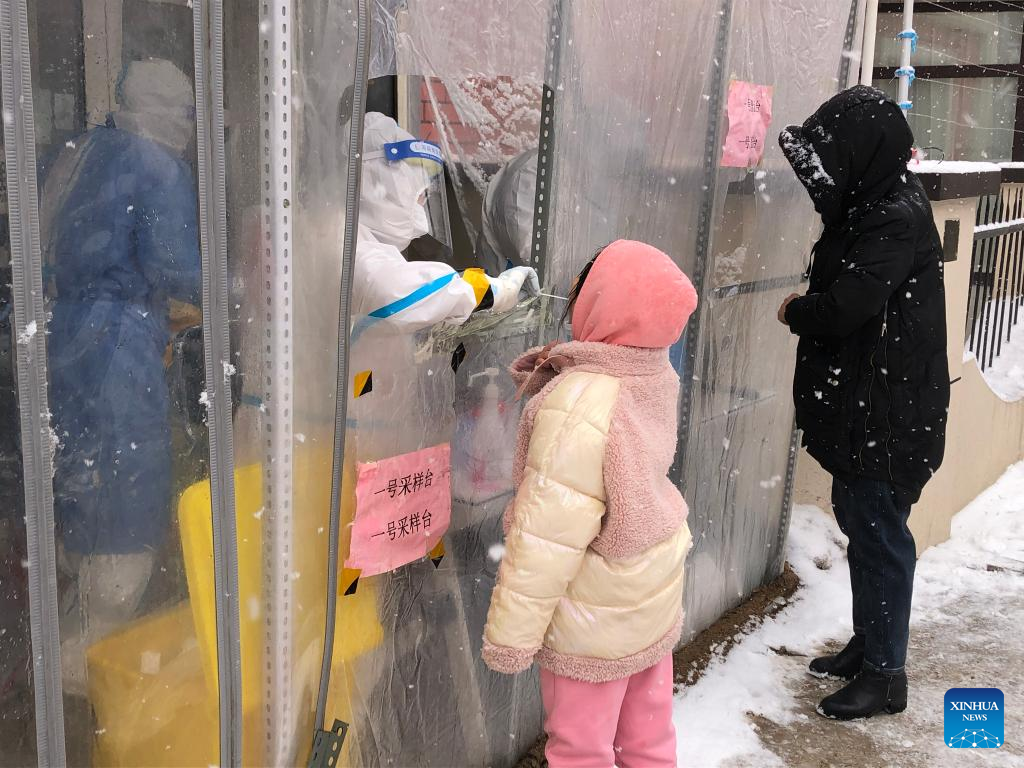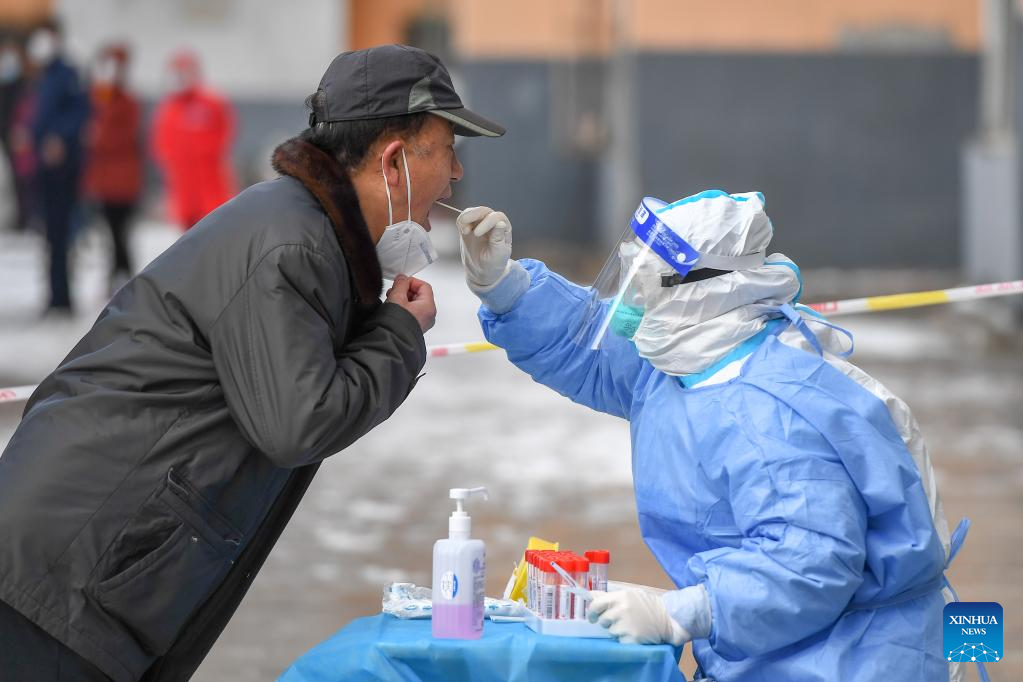 Cellphone photo taken on March 15, 2022 shows a medical worker taking a swab sample from a resident for nucleic acid test in Changchun, northeast China's Jilin Province, March 15, 2022. Jilin Province reported 3,076 new locally transmitted COVID-19 cases on Monday. (Xinhua/Zhao Dandan)