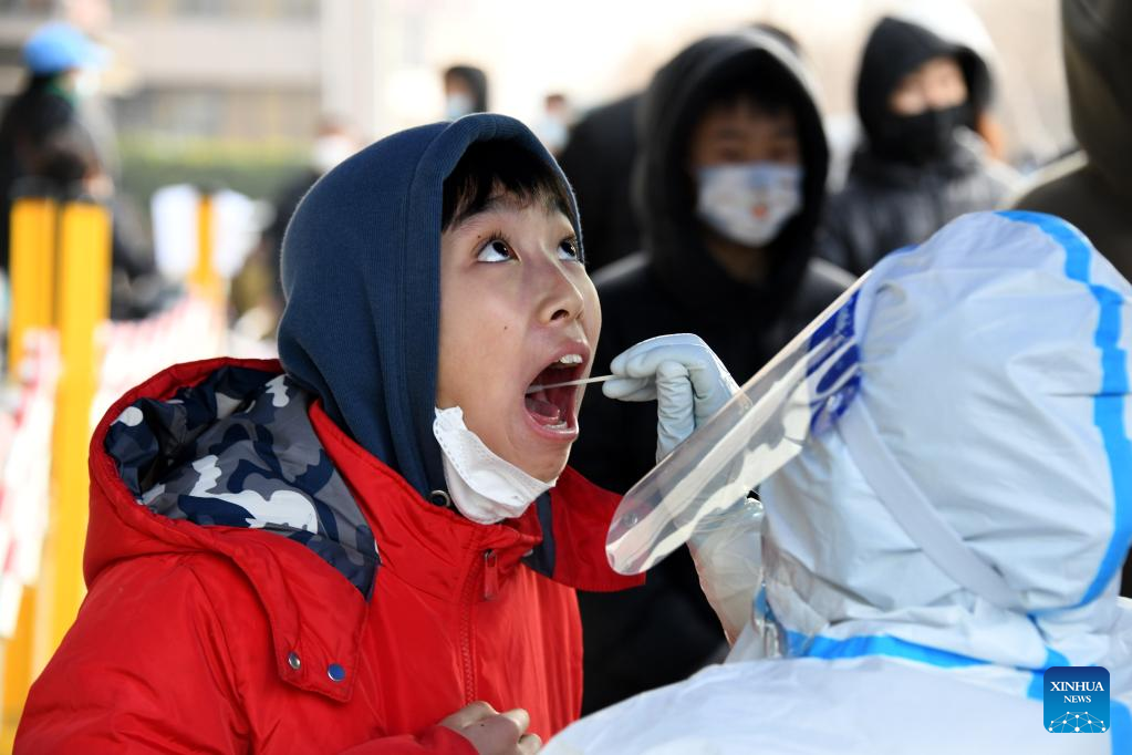 Medical workers take swab samples from people for nucleic acid test at Shibei District, Qingdao City, east China's Shandong Province, March 15, 2022. Qingdao has strengthened its epidemic prevention and control measures in response to the resurgence of domestically transmitted COVID-19 cases. (Xinhua/Li Ziheng)