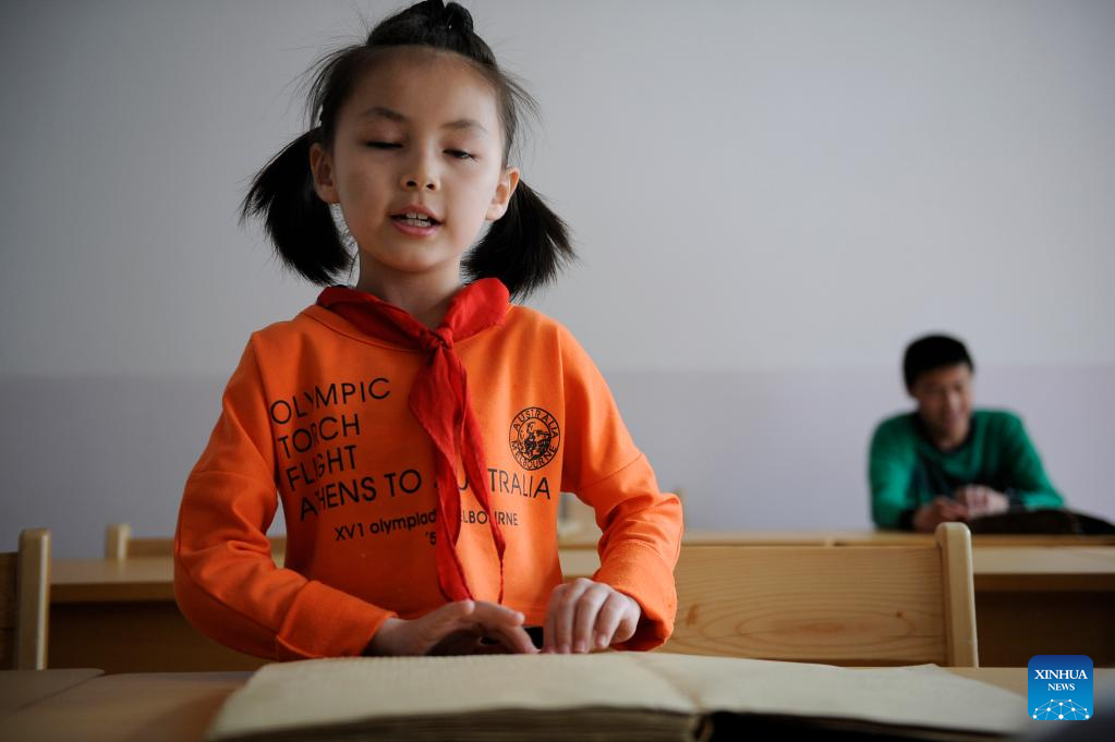 Ma Yifei reads a braille book during a class in Yinchuan, northwest China's Ningxia Hui Autonomous Region, May 21, 2013.(Photo by Li Jing/Xinhua)