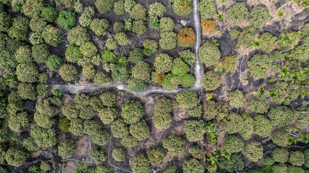 Aerial photo taken on March 15, 2022 shows a farmer working among litchi trees in Yongxing Township of Haikou City, south China's Hainan Province. (Xinhua/Zhang Liyun)