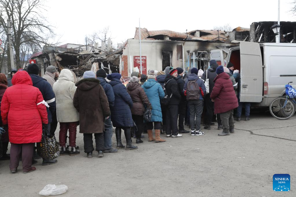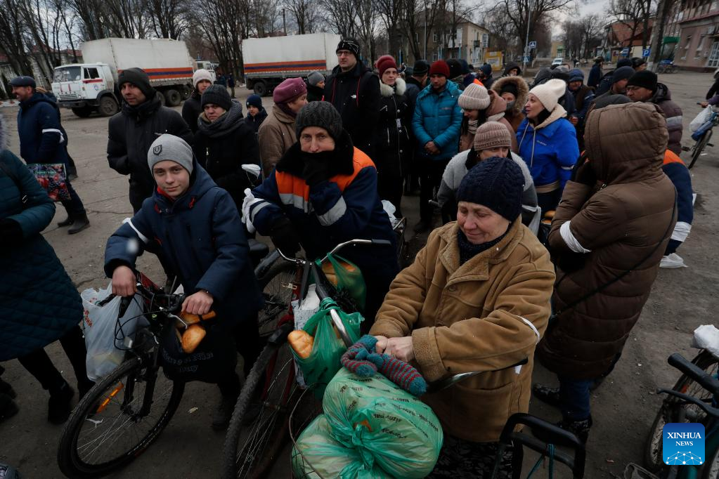 Local residents queue up to receive humanitarian aid in Volnovakha of Donetsk, March 15, 2022. (Photo by Victor/Xinhua)