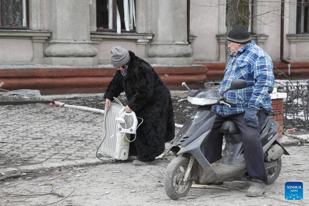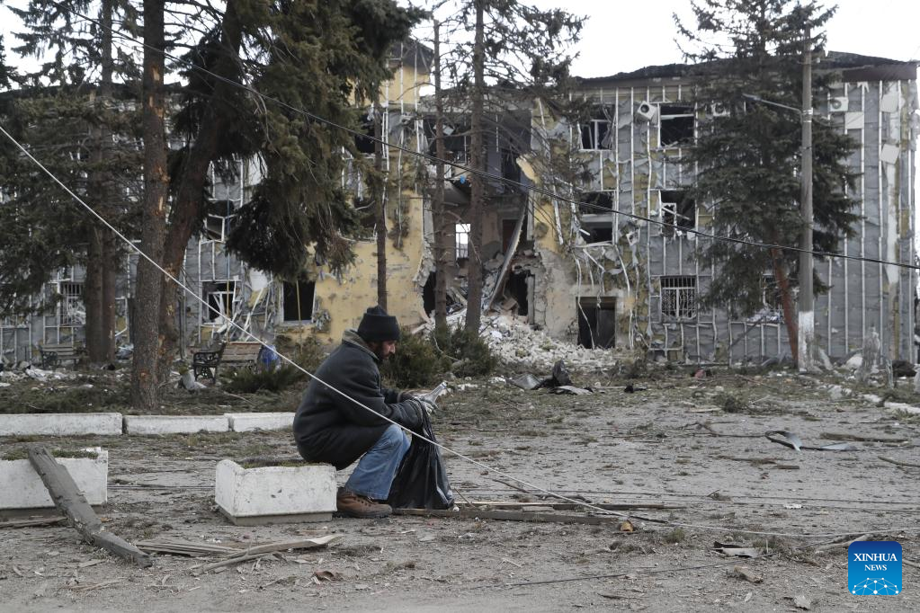 Local residents carry their stuff outside a damaged building in Volnovakha of Donetsk, March 15, 2022. (Photo by Victor/Xinhua)