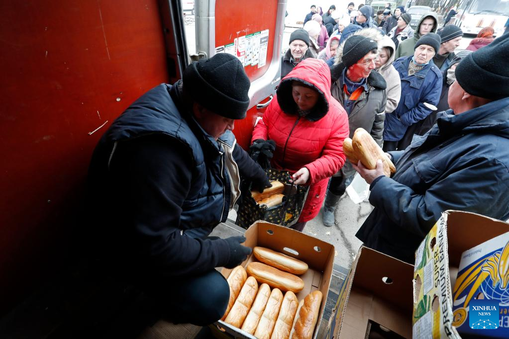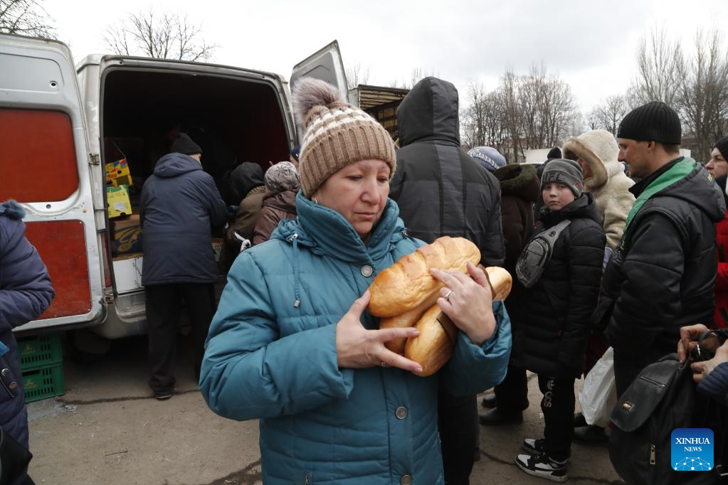 A local resident carries received bread in Volnovakha of Donetsk, March 15, 2022. (Photo by Victor/Xinhua)