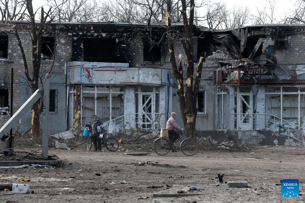 Local residents are seen outside a damaged building in Volnovakha of Donetsk, March 15, 2022. (Photo by Victor/Xinhua)