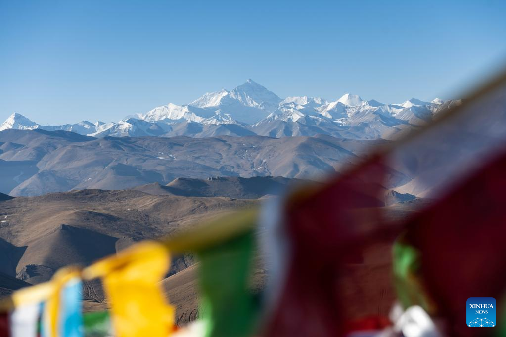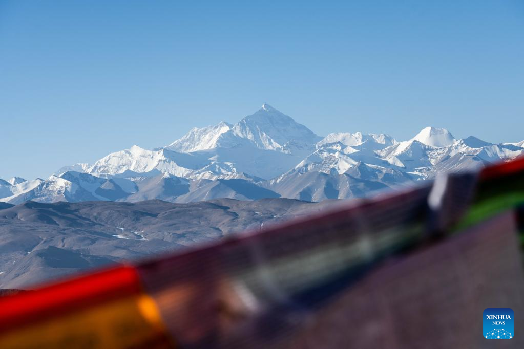 Photo taken on March 15, 2022 shows a view of Mount Qomolangma seen through a prayer flag from Xigaze City of southwest China's Tibet Autonomous Region. (Xinhua/Zhou Dixiao)