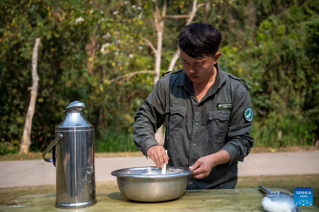 Xu Yunfeng, a wildlife conservation worker, prepares food for Asian elephant "Longlong" at the Asian Elephant Breeding and Rescue Center in Xishuangbanna Dai Autonomous Prefecture, southwest China's Yunnan Province, March 15, 2022.