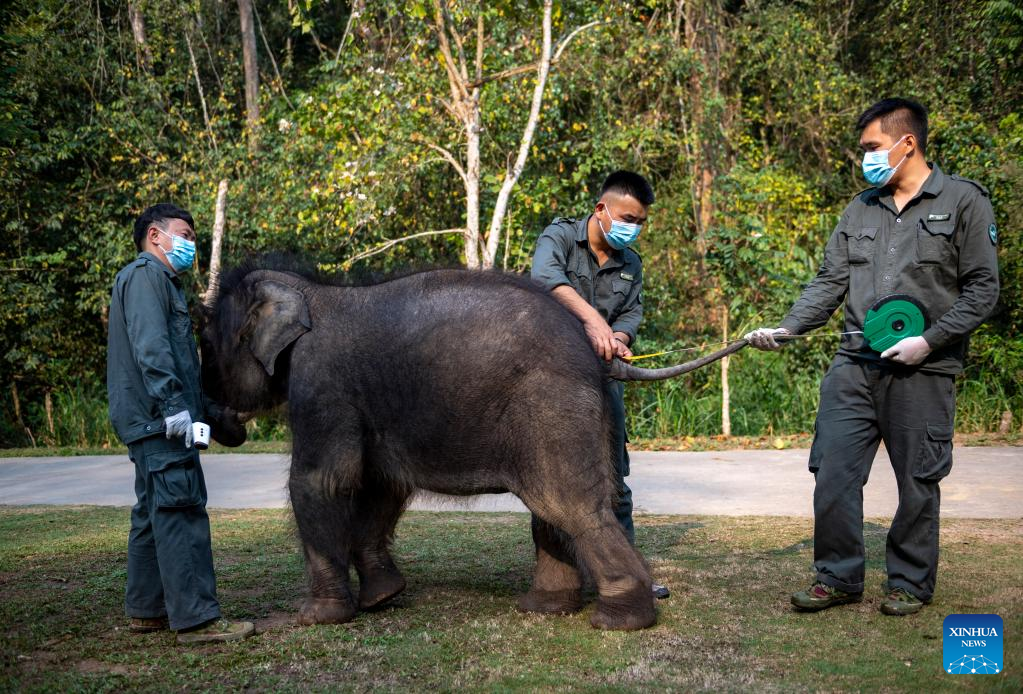 Wildlife conservation workers measure the tail of Asian elephant "Longlong" at the Asian Elephant Breeding and Rescue Center in Xishuangbanna Dai Autonomous Prefecture, southwest China's Yunnan Province, March 15, 2022.