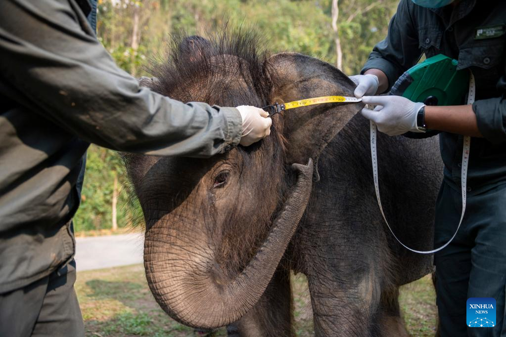 Wildlife conservation workers measure the ear of Asian elephant "Longlong" at the Asian Elephant Breeding and Rescue Center in Xishuangbanna Dai Autonomous Prefecture, southwest China's Yunnan Province, March 15, 2022.