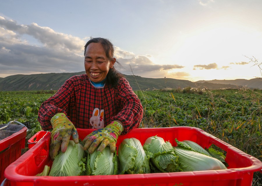 A farmer harvests Chinese cabbages at a vegetable planting base in Gaoyuan Village of Xiji County, northwest China's Ningxia Hui Autonomous Region, Sept. 7, 2020. (Xinhua/Yang Zhisen)