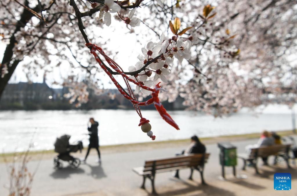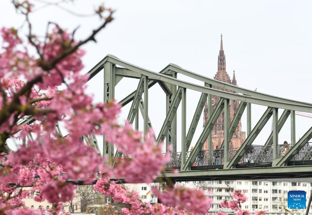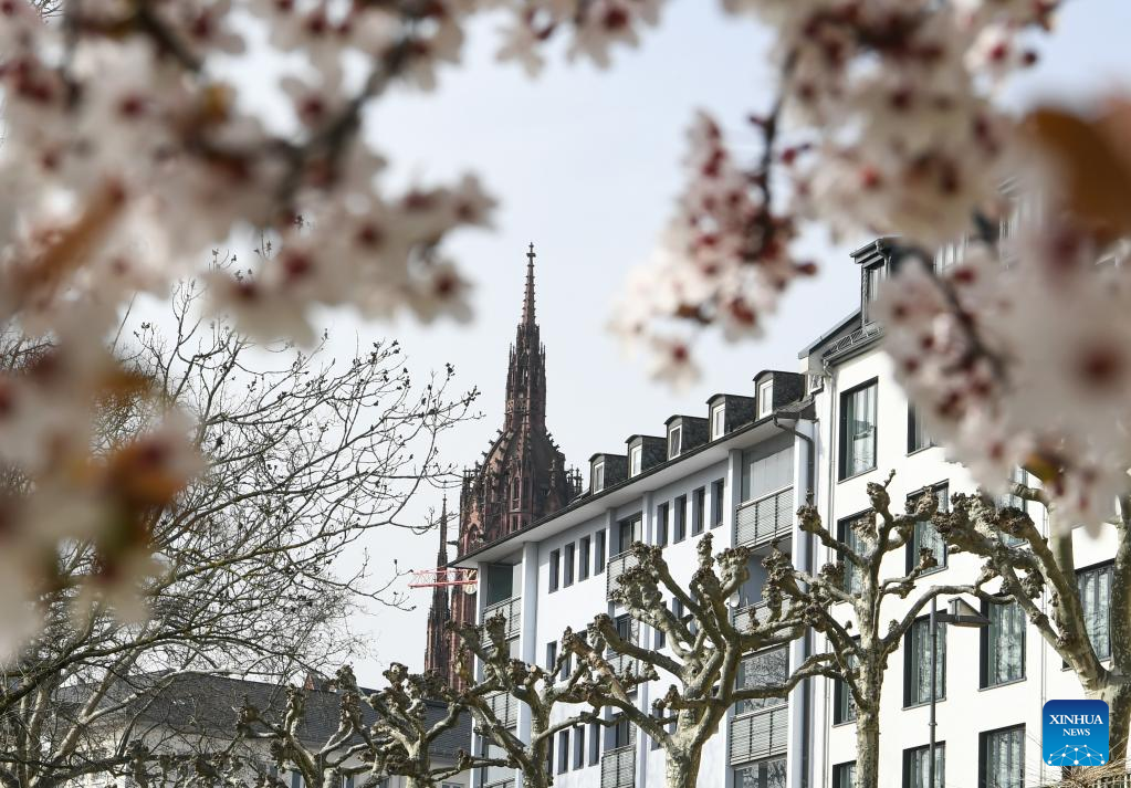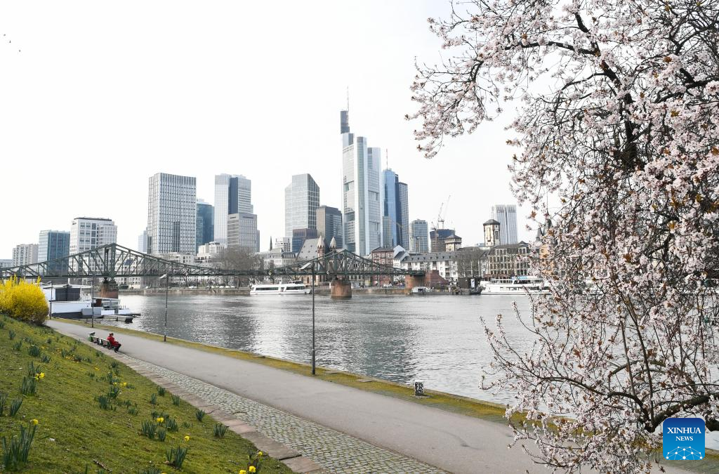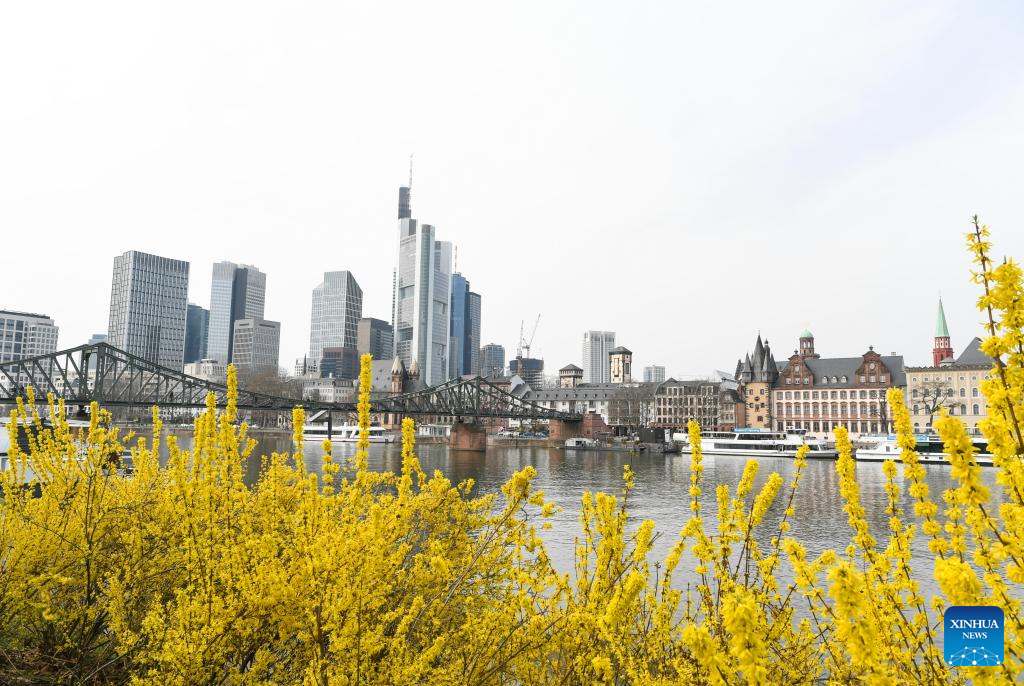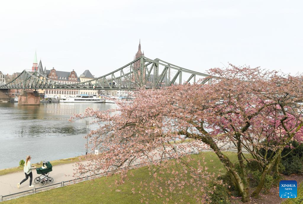 Flowers blossom on the bank of the Main River in Frankfurt, Germany, on March 16, 2022. (Xinhua/Lu Yang)