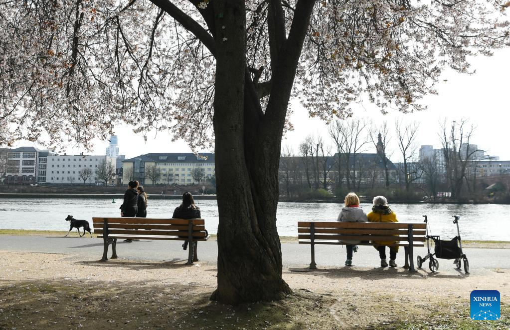 People enjoy spring time on the bank of the Main River in Frankfurt, Germany, on March 16, 2022. (Xinhua/Lu Yang)