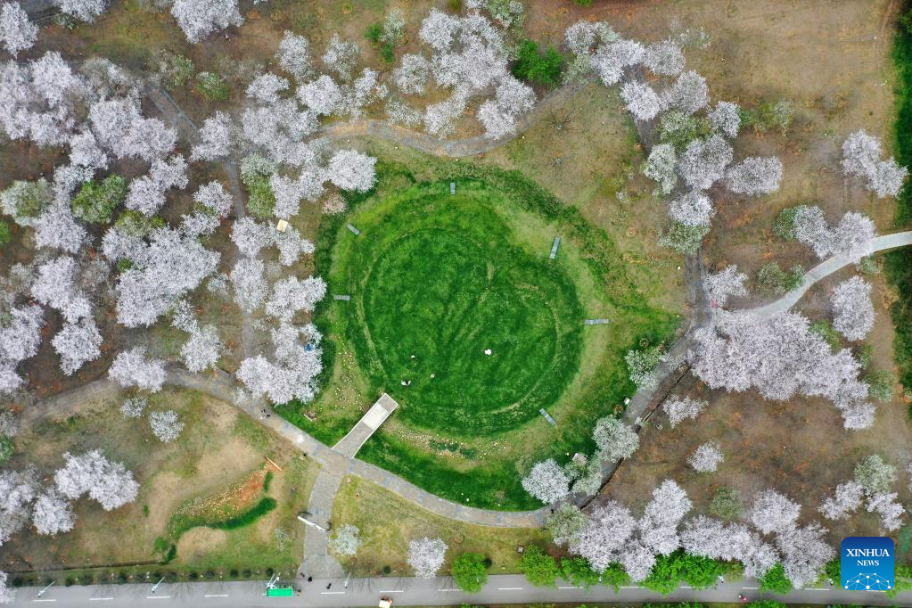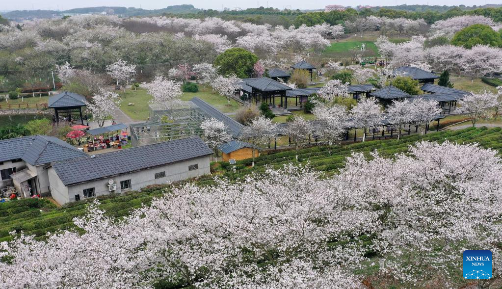 Aerial photo taken on March 16, 2022 shows blossoms at Fenghuanggou scenic area in Nanchang County of east China's Jiangxi Province. (Xinhua/Peng Zhaozhi)