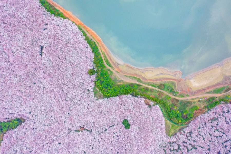Aerial photo taken on March 17, 2022 shows blooming cherry blossoms at a cherry garden in Gui'an New Area of Guiyang, southwest China's Guizhou Province. (Xinhua/Ou Dongqu)