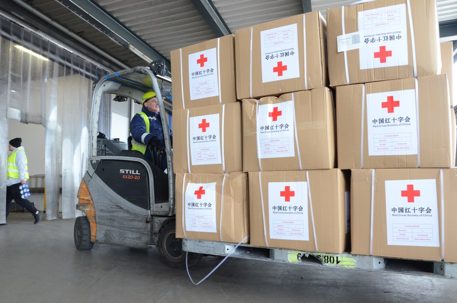 Humanitarian aid supplies sent by the Red Cross Society of China to the Ukrainian Red Cross Society are transported in Warsaw, Poland, March 15, 2022. (Xinhua/Chen Chen)