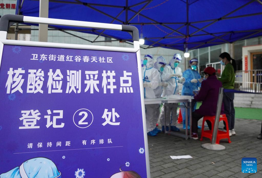 People take nucleic acid tests at a residential area in Honggutan District of Nanchang, east China's Jiangxi Province, March 17, 2022. Nanchang carried out mass COVID-19 testing for citizens on Thursday. (Xinhua/Peng Zhaozhi)