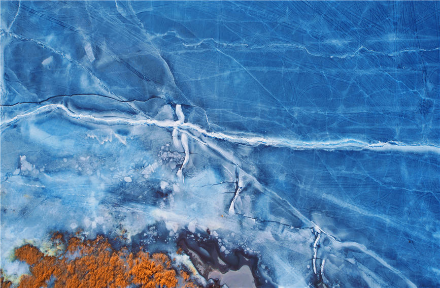 Bosten Lake, surrounded by golden sands, in Hoxud county, Bayingolin Mongolian Autonomous Prefecture, northwest China's Xinjiang Uygur Autonomous Region, is the largest inland freshwater lake in China, as well as the largest fishery production base in the region. Frozen during winter, the lake starts thawing as temperatures rise, leaving cracks on its icy surface. Seen from above, the ice cracks resemble dragon scales, while the blueness of the lake is enhanced by the surrounding yellow reeds, forming a vibrant, oil painting-like scene.