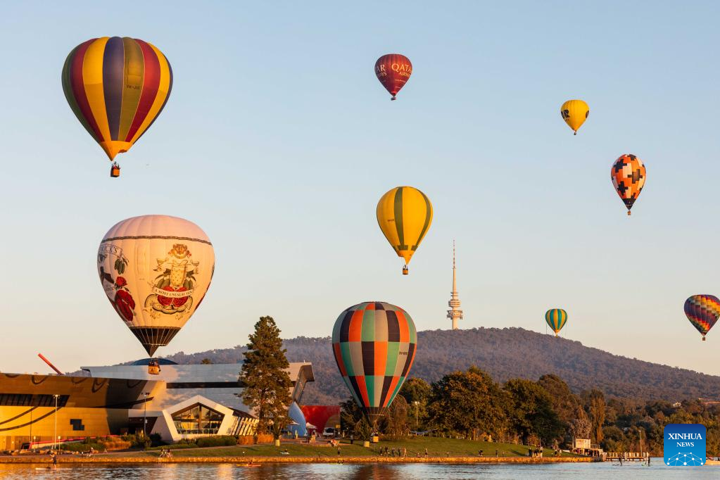 Hot air balloons are seen during the annual Canberra Balloon Spectacular festival in Canberra, Australia, March 18, 2022. The annual Canberra Balloon Spectacular festival, a hot air balloon festival celebrated in Australia's capital city, is held this year from March 12 to 20. (Photo by Chu Chen/Xinhua)