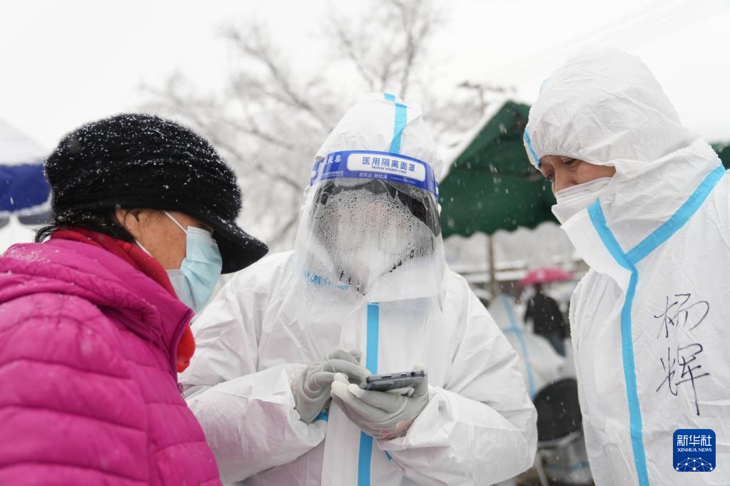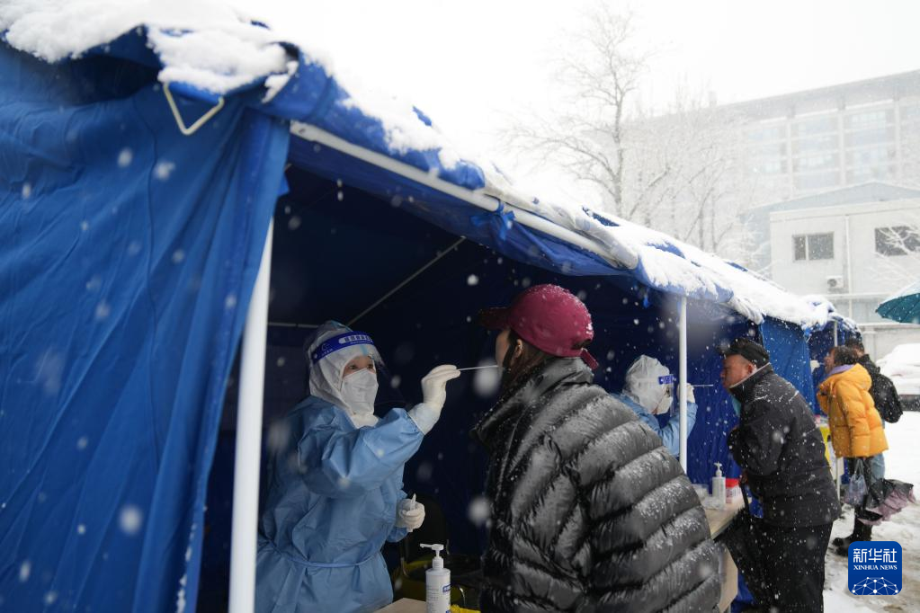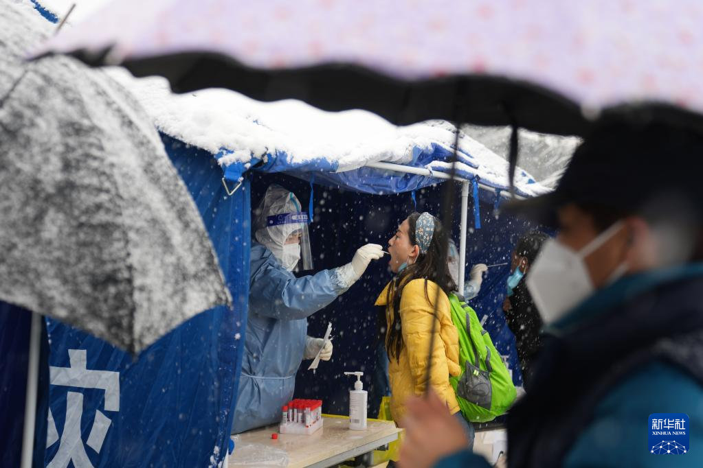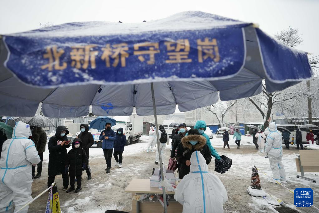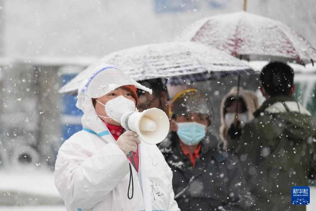 A staff member guides residents in snow at a COVID-19 testing site in Beijing, capital of China, March 18, 2022. (Xinhua/Ju Huanzong)