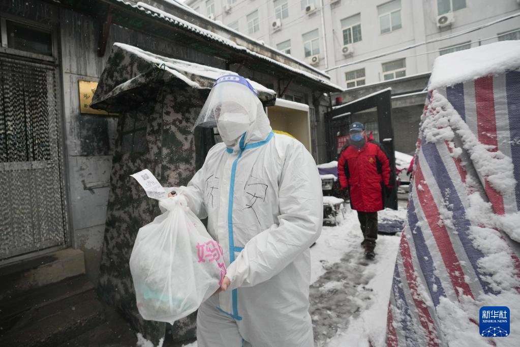 A staff member takes deliveries for residents under temporary home quarantine at a residential area in Beijing, capital of China, March 18, 2022. (Xinhua/Ju Huanzong)