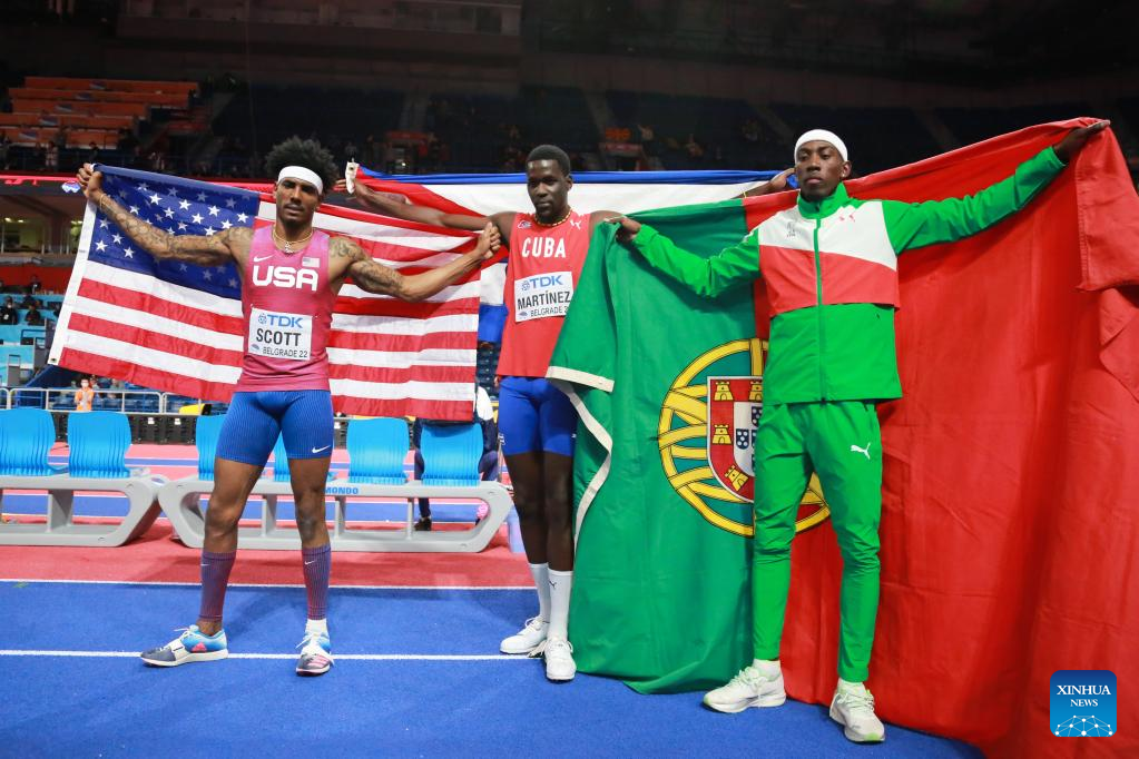 Bronze medalist Donald Scott of the United States, gold medalist Lazaro Martinez of Cuba and silver medalist Pedro Pichardo of Portugal (From L to R) celebrate after the men's triple jump final at the World Athletics Indoor Championships Belgrade 2022 in Stark Arena, Belgrade, Serbia, March 18, 2022. (Xinhua/Shi Zhongyu)