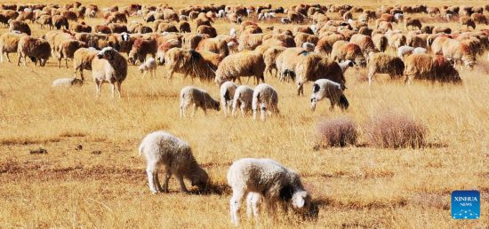 Photo taken with a mobile phone shows sheep on the south bank of the Yamzbog Yumco Lake in Shannan, southwest China's Tibet Autonomous Region, March 19, 2022. (Xinhua/Shen Hongbing)