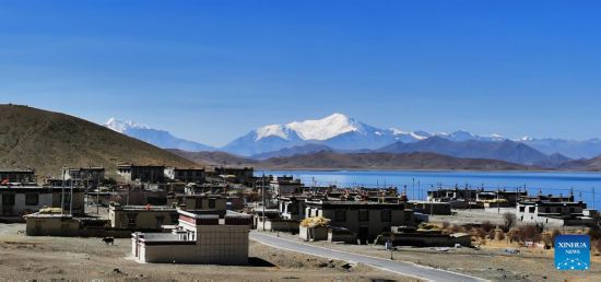 Photo taken with a mobile phone shows a village on the south bank of the Yamzbog Yumco Lake in Shannan, southwest China's Tibet Autonomous Region, March 19, 2022. (Xinhua/Shen Hongbing)
