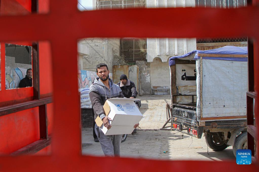 A refugee receives food from a distribution center of the United Nations Relief and Works Agency for Palestine Refugees in the Near East (UNRWA) at Al-Shati refugee camp in Gaza City, March 20, 2022. (Photo by Rizek Abdeljawad/Xinhua)