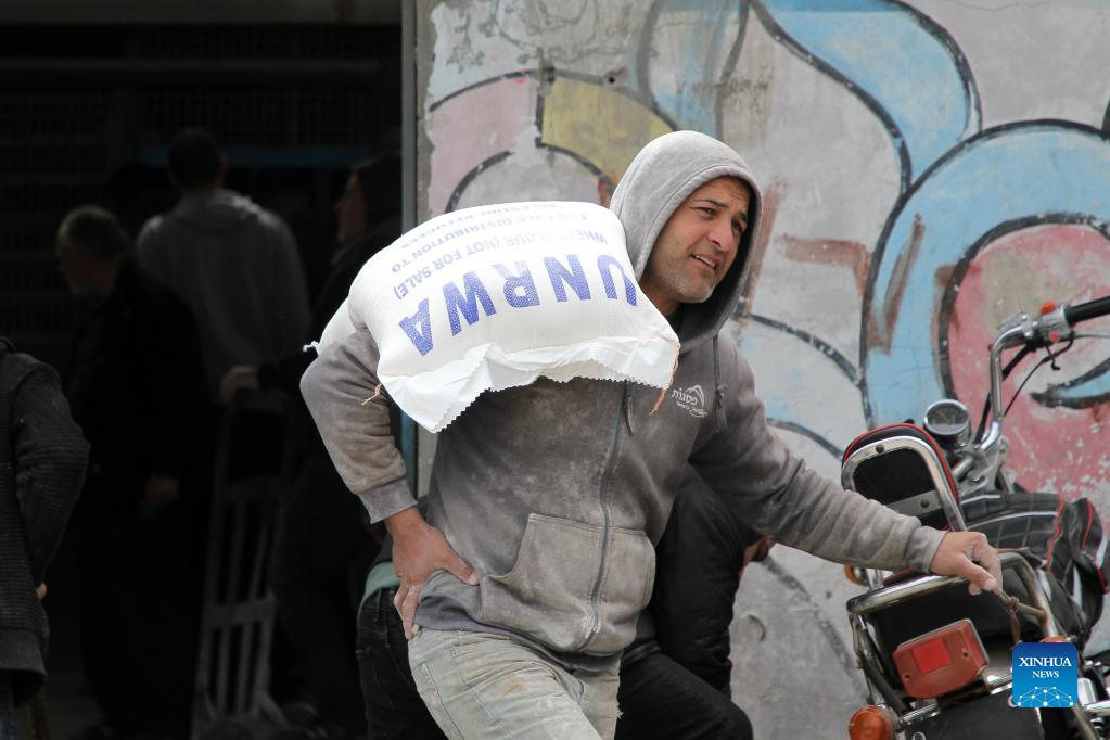 A worker carries a sack of flour at a distribution center of the United Nations Relief and Works Agency for Palestine Refugees in the Near East (UNRWA) at Al-Shati refugee camp in Gaza City, March 20, 2022. (Photo by Rizek Abdeljawad/Xinhua)
