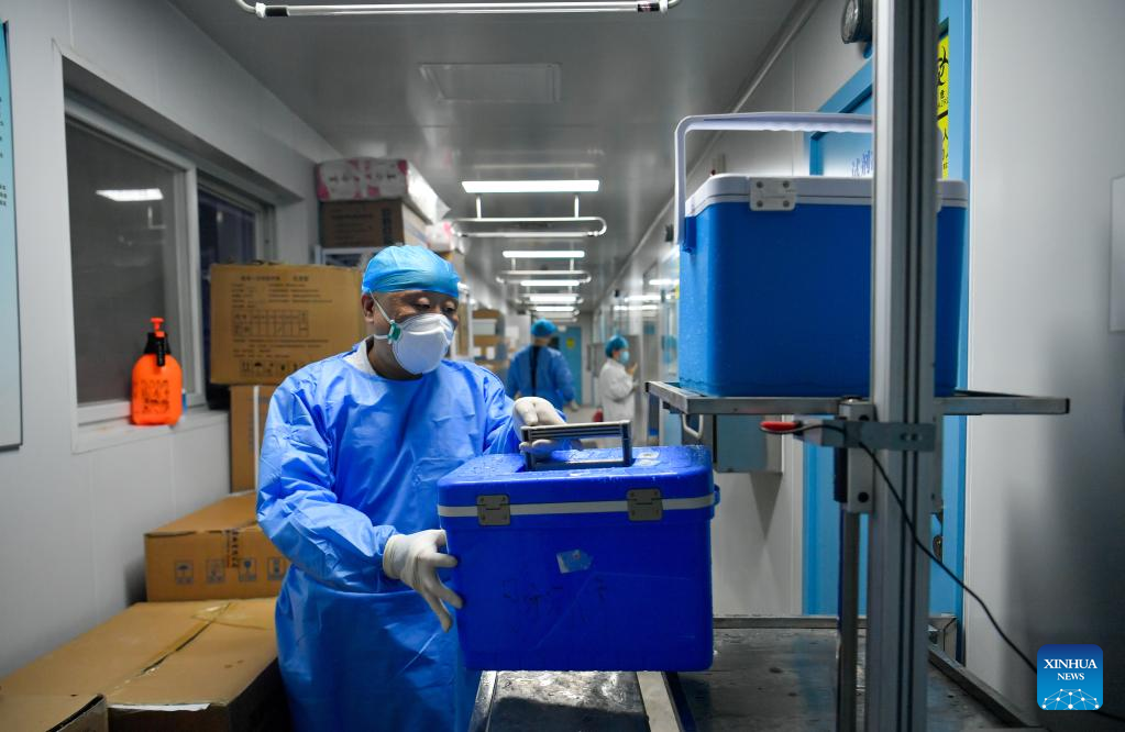 A staff member transfers a box containing nucleic acid test samples at a nucleic testing base in Hebei District of Tianjin, north China, March 19, 2022. The base has a maximum daily testing capability of 15,000 tubes of 150,000 samples. (Xinhua/Sun Fanyue)