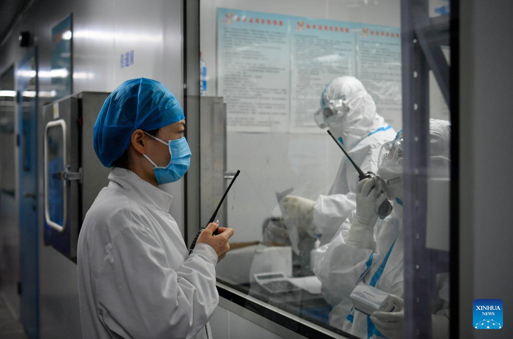 Staff members work at a nucleic testing base in Hebei District of Tianjin, north China, March 19, 2022. The base has a maximum daily testing capability of 15,000 tubes of 150,000 samples. (Xinhua/Sun Fanyue)