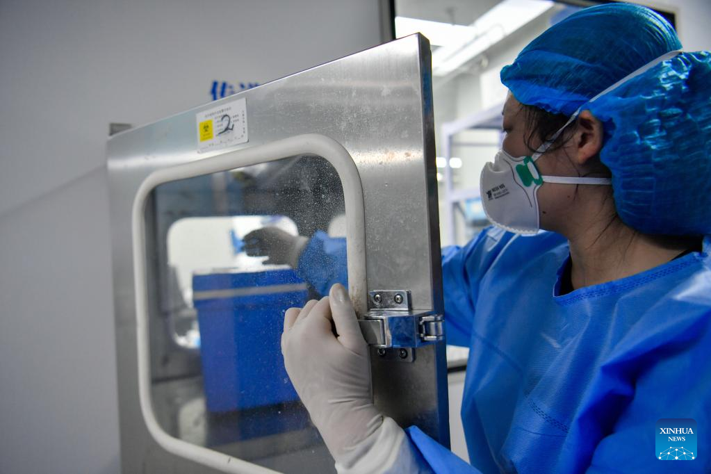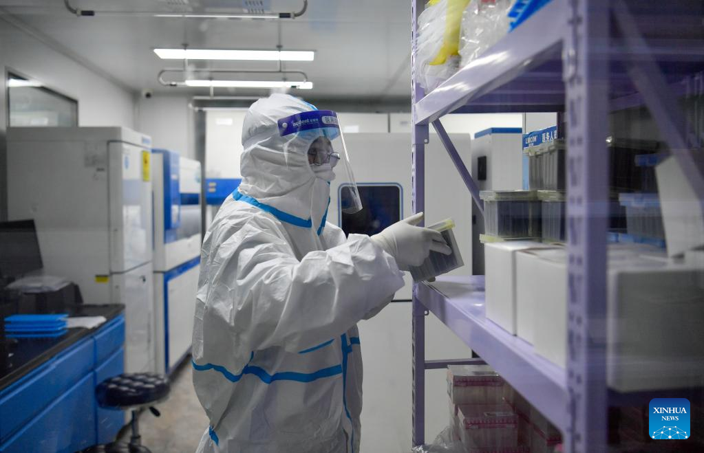 A staff member works at a nucleic testing base in Hebei District of Tianjin, north China, March 19, 2022. The base has a maximum daily testing capability of 15,000 tubes of 150,000 samples. (Xinhua/Sun Fanyue)