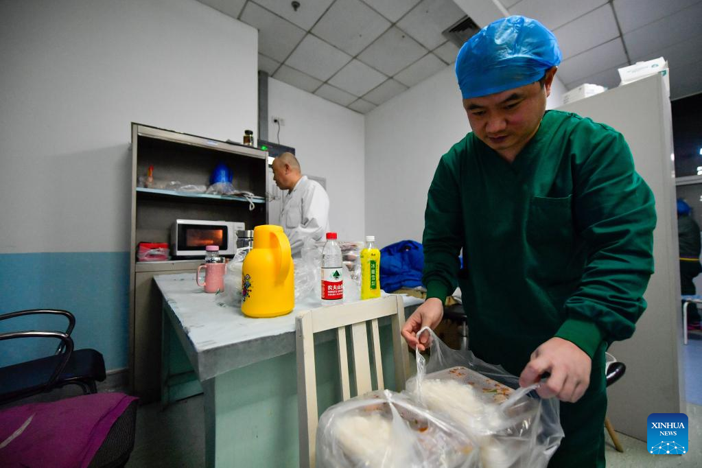 Staff members heat food during work shift at the lounge of a nucleic testing base in Hebei District of Tianjin, north China, March 19, 2022. The base has a maximum daily testing capability of 15,000 tubes of 150,000 samples. (Xinhua/Sun Fanyue)