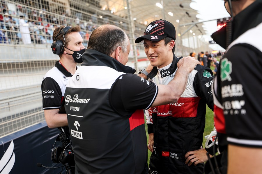 Alfa Romeo team principal Fred Vasseur (L) chats with Zhou before his debut race. (DPPI/Handout via Xinhua)