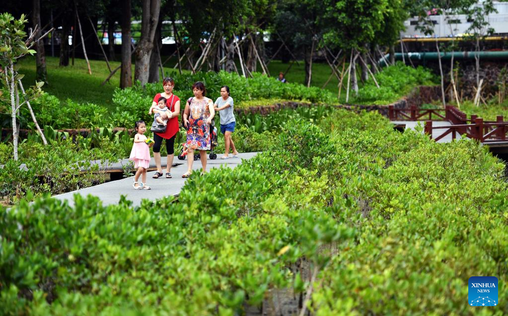 Citizens take a walk at the riverside of Meishe River in Haikou, south China's Hainan Province, July 10, 2017. Dubbed the "mother river" of Haikou, Meishe was recently listed among "the country's 11 most beautiful hometown rivers" by the Ministry of Water Resources.(Xinhua/Guo Cheng)